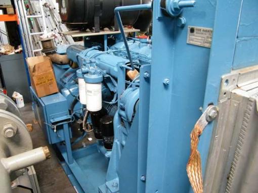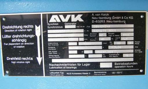 IVECO- Dieselmotor für Generatorantrieb mit elektronischen Drehzahlregler, Generator A. van Kaick, in Schutzart IP 23, bürstenlos, elektronisch geregelt, Grundrahmen zur Aufnahme der Motor / Generatoreinheit, elastische Lagerung zwischen Maschinensatz und Grundrahmen, die Kühlung des Aggregates erfolgt über einen vorgebauten Wabenkühler, Antrieb direkt über den Dieselmotor. BJ 1995