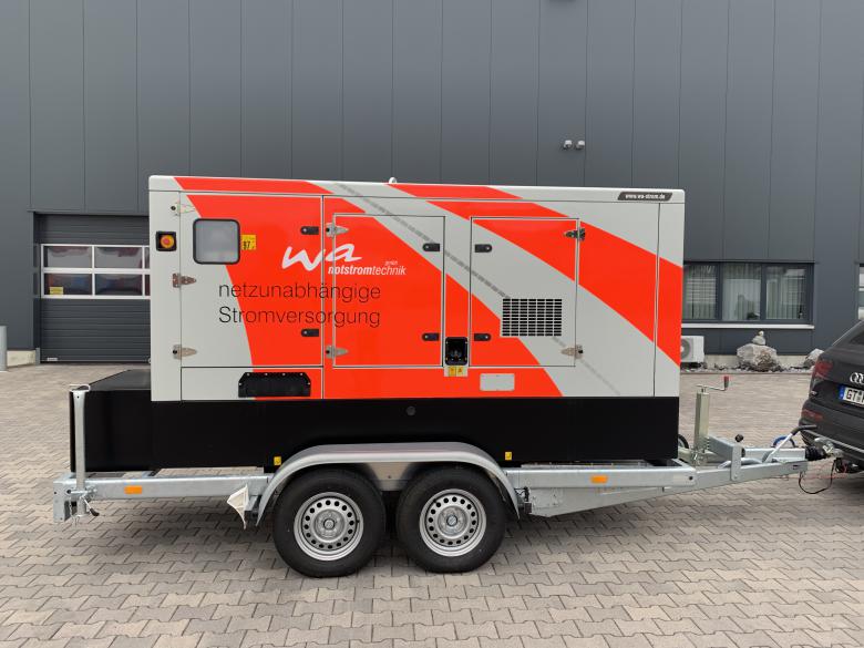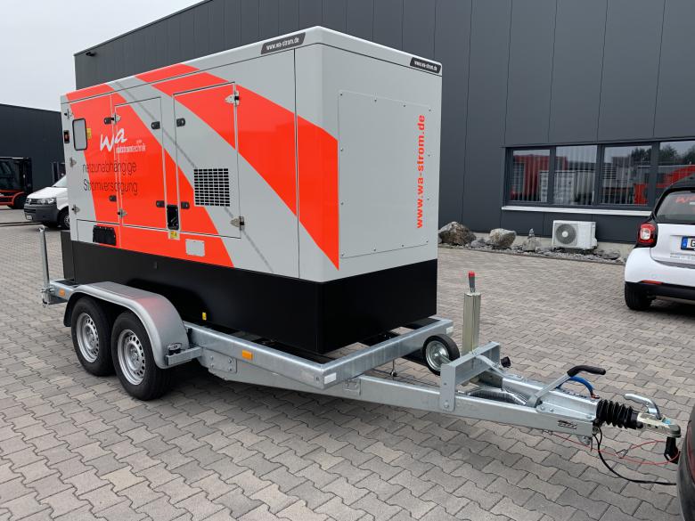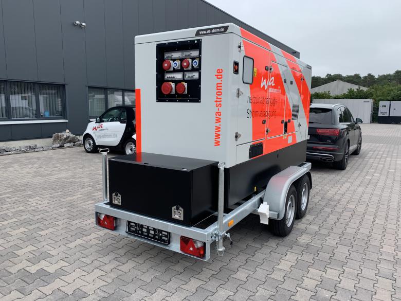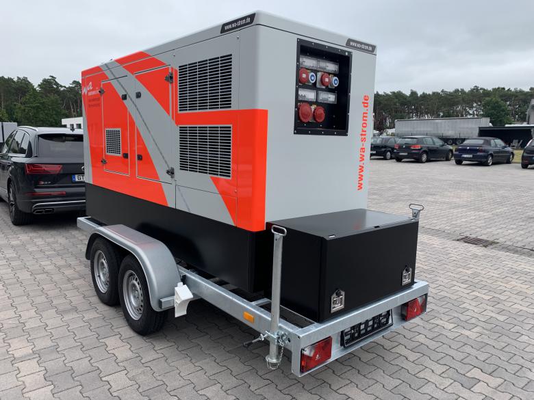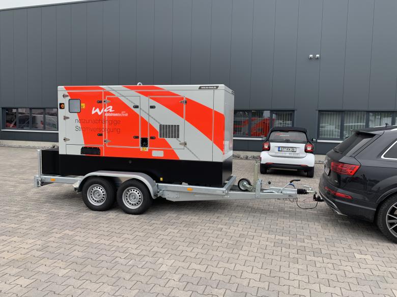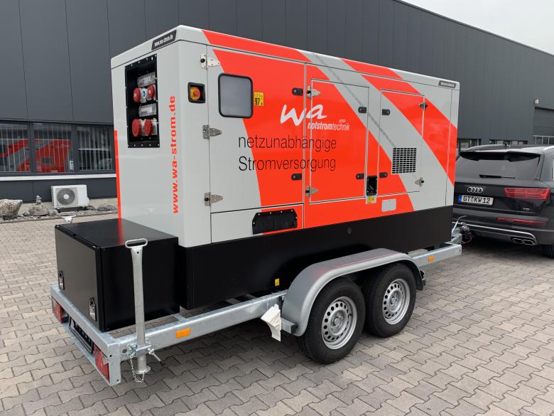 Aufgebaut auf einem Tandem-Fahrgestell mit starrer Zugdeichsel inkl. Staubox am Heck des Stromerzeugers.