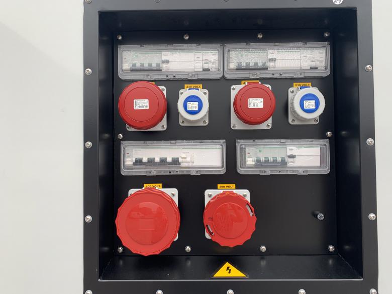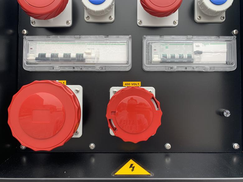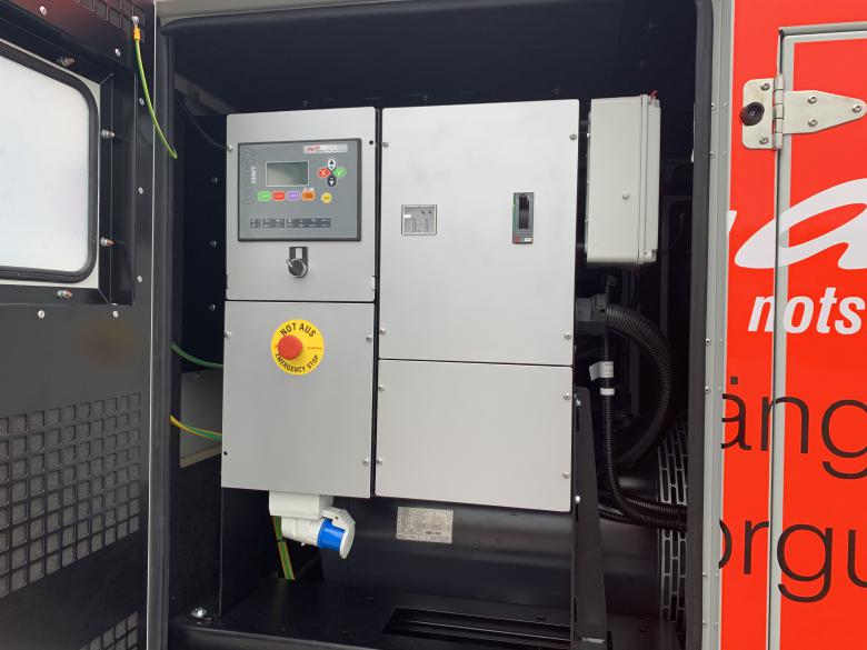 Steuerung am Aggregat hinter einer Sichtschutztür, mit Elektrostart, Kühlwasservorheizung und Batterieladegerät mit Einspeisesteckdose inkl. Generatorschalter. Vorbereitet für Notstrombetrieb, nach CE Richtlinie gefertigt.
