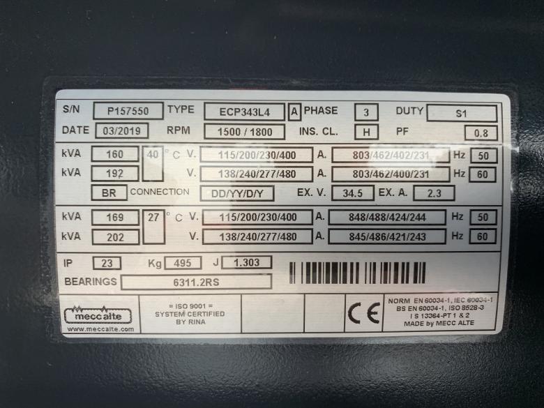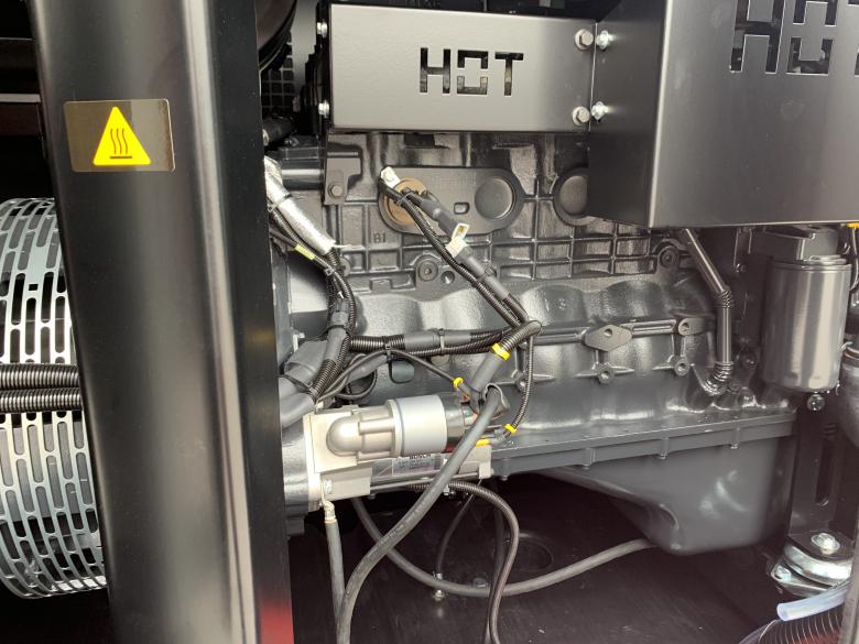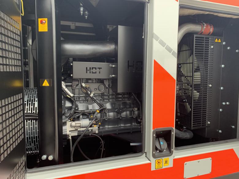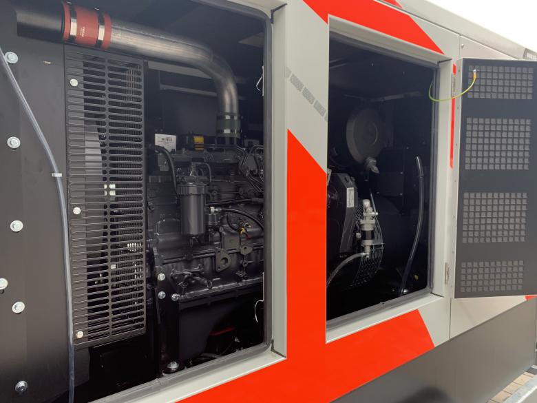 Diesel-Drehstrom-Aggregat mit einem FPT Iveco Motor, eingebaut in einer Schall- u. Wetterschutzhaube (Pulverbeschichtet in RAL 7035) mit seitlichen Wartungstüren.