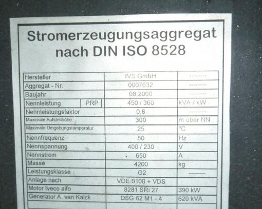 Netzersatzanlage BJ 08 / 2000 bestehend aus: IVECO- Dieselmotor für Generatorantrieb mit elektronischen Drehzahlregler, Generator A. van Kaick, bürstenlos, elektronischer Regler, Grundrahmen, elastische Lagerung, die Kühlung des Aggregates erfolgt über einen vorgebauten Wabenkühler.