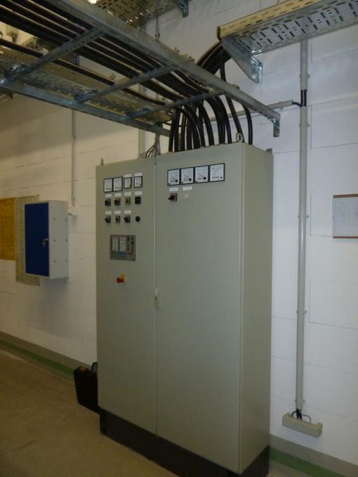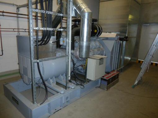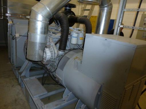 Notstromaggregat (BJ 2003) als Netzersatzanlage nach VDE 0108 und VDS aus BJ 2003, bestehend aus: IVECO- Dieselmotor für Generatorantrieb mit elektronischen GAC Drehzahlregler, Generator bürstenlos, elektronischer Regler, Grundrahmen, elastische Lagerung, die Kühlung des Aggregates erfolgt über einen vorgebauten Wabenkühler.